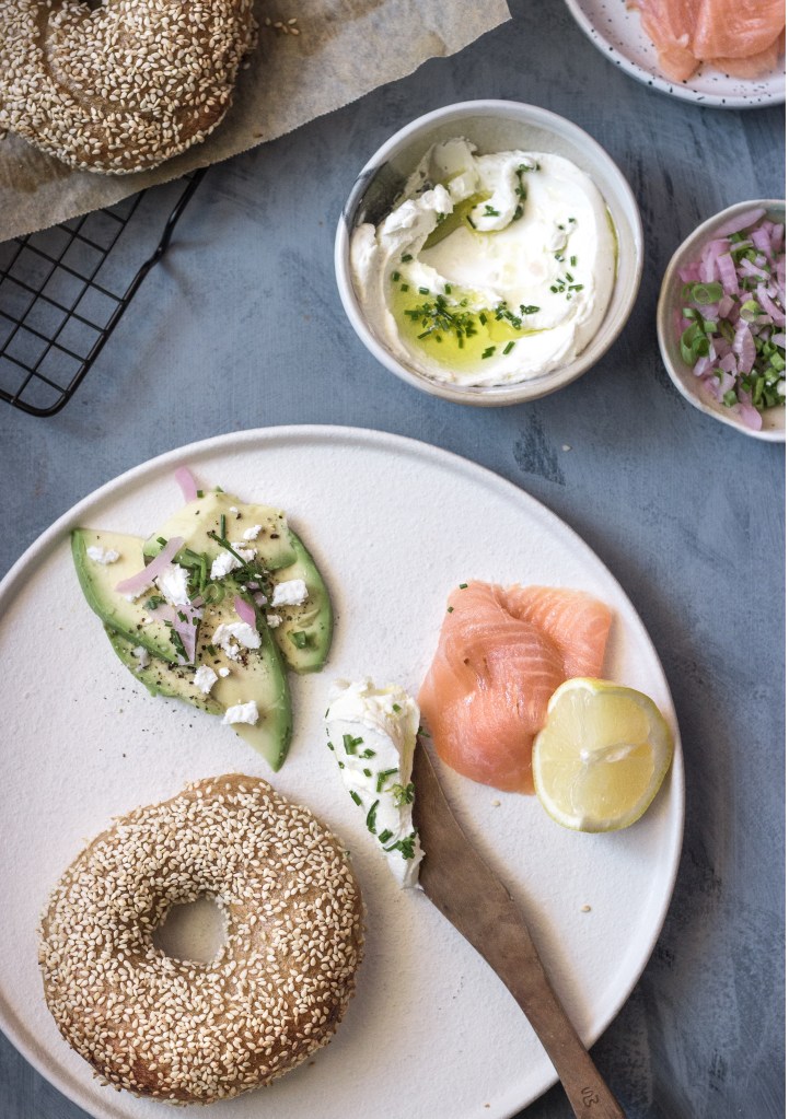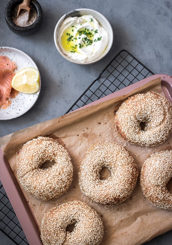 Another round of snap lockdown here in Melbourne called for some more indulgent breakfast options, and bagels were number 1 on the list this time. There’s something so addictive in that chewy boiled crust of theirs. As they are made with a sourdough starter you will need to start prepping them a couple of days in advance, but they seriously do not require much active time, just some rest & ferment time in between, and as with everything sourdough- totally worth it. As with my Cinnamon & Hot Cross Buns‘ recipes, I suggest you start on evening of day 1 (36h before baking), put the dough together in the morning of day 2, shape them in the early afternoon, and then after their final rise just let them rest in the fridge till morning on day 3 when they are ready to be boiled and baked. If you roll them in sesame generously enough they are just amazing with only some butter smeared on them, but you can of course go all in and serve with some smoked salmon, avocado, pickled onion and cream cheese or my new favourite swap for cream cheese – labneh (so easy to make, just scroll down for a quick recipe on how to make it).