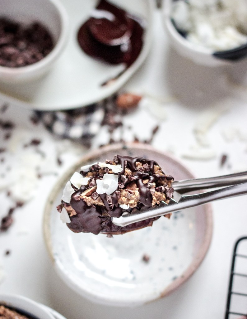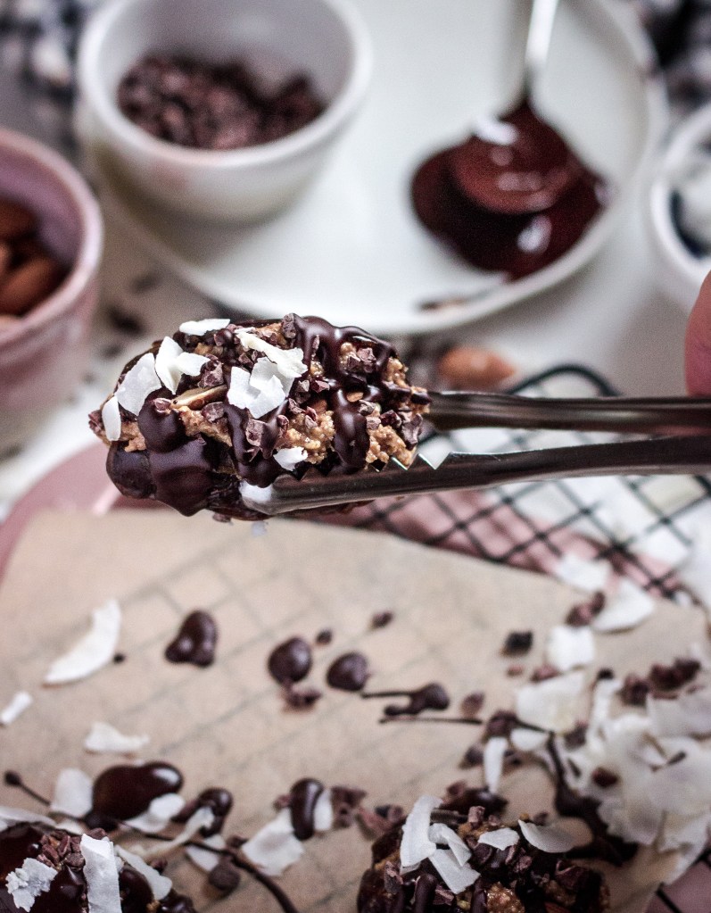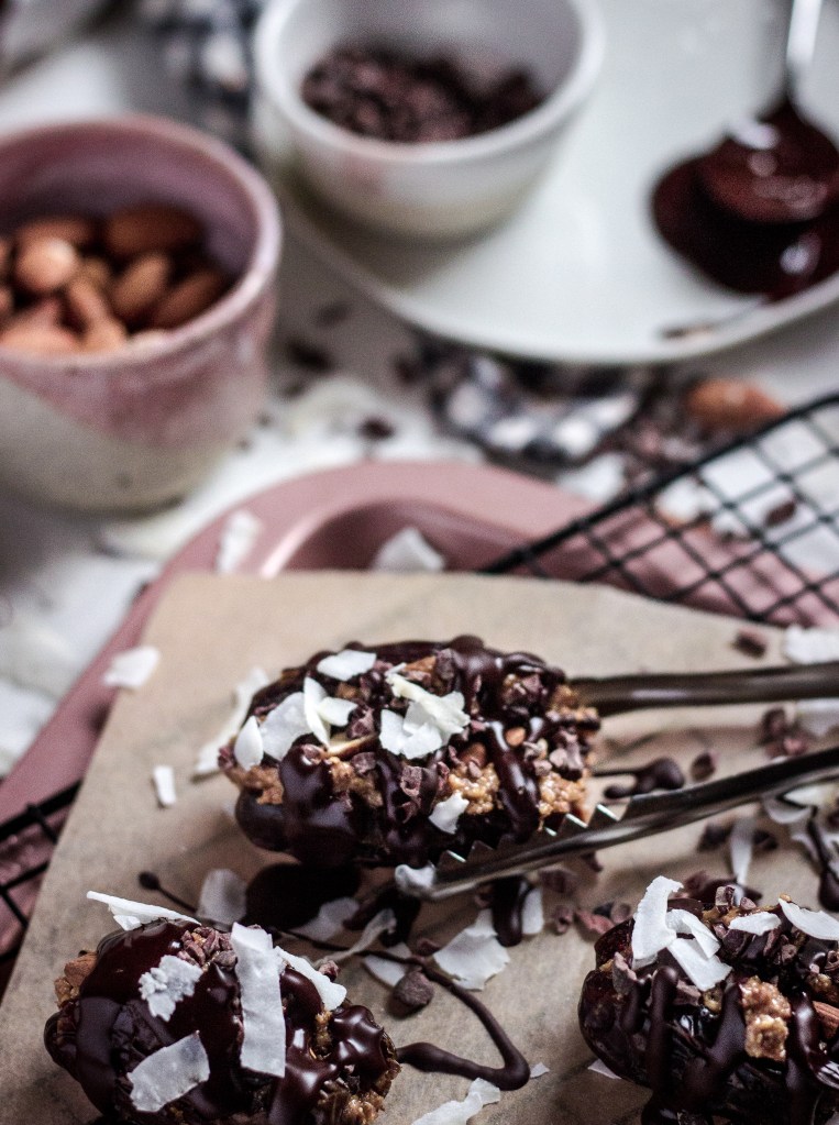 - Using a small spoon, drizzle a spoon of melted dark chocolate over each date. If you want them super chocolatey, you can also dip each date into the chocolate (in this case, I suggest to fill the dates with the almond butter, almonds and nibs, gently pressing them together and chilling in the freezer for 15min – that way it will be way less messy as the chocolate will harden as soon as you dip them.