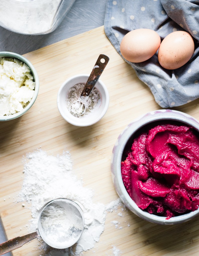 Not sure how many people there are that don’t love pasta, I certainly do. And even though I could probably have all your more typical shapes like spaghetti, penne, fusilli, and so on pretty much daily, gnocchi are a nice change, offering a completely different texture, and since you can add different root veggies into the dough, they not only have a very cool colour but also feel way less naughty. You can make a big batch of these, freeze them, and they are cooked in no time when you want to have them. I used one sweet potato and one beetroot for this recipe, but you can do them just with sweet potatoes, only with beetroot or even with potatoes or other roots. Ricotta is optional here, you might need to add a little bit more flour if using it. A note on the dough – it will feel a bit sticky, but we want our gnocchi super light and fluffy. Just make sure your surface on which you shape them is covered with flour well, so they don’t stick to it. That way we are only adding more flour to the surface of each little pillow and not in the dough, which will give us the desired texture. I tried taking many photos of the in between stages, so scroll down for those. Gnocchi will go well with different sauces, especially slightly creamy ones, or simply pan fried on some ghee, with sage leaves, fresh goat’s cheese, pine nuts and parmesan. I quite like them pan-fried, and tossed with some halved, oven baked Brussels sprouts with salt, pepper and thyme, topped with a generous serve of grated parmesan and pine nuts or walnuts.
